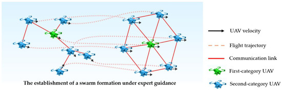 In the mission of UAV swarm formation, behavior presentation constructs the teacher–student dataset by using an offline sampling method. Specifically, the teacher dataset is generated by the expert demonstration and covers collaborative interaction data such as formation pattern information, mission trajectory information and individual state information, while the dataset generated by the UAV’s self-operated operation is treated as the student dataset, which records the behavior characteristics of the individuals and their interactions with the other members during the execution of the formation mission. Figure 4 demonstrates the process of a swarm composed of different types of UAVs completing the formation under expert guidance.