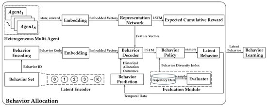 where represents the latent behavior variables assigned to all agents, represents the observation sequence of all agents, represents the potential behavior variables from the 1st to the (th agent, includes the behavior assignments of these agents, representing the historical behavior assignments of the previous steps and represents the generated behavior allocation policy. To enhance the behavior diversity of UAV swarms, this paper introduces the behavior diversity index to assess the rationality of behavior allocation based on global implicit information and local observations [37].