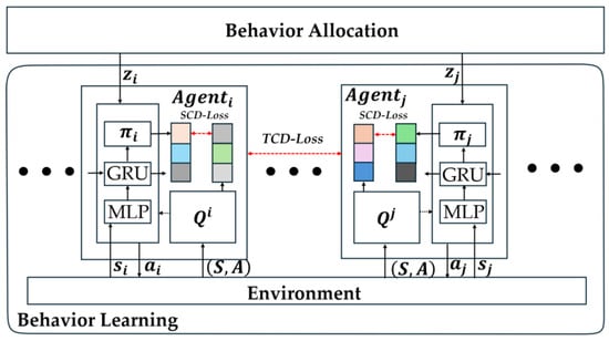 In the behavior allocation phase, the multi-agent system assigns differentiated behaviors to each intelligent body. In the behavior learning phase, it provides for the clarification of the learning goals of each agent and the full use of its unique strengths. The Critic network generates a global target probability distribution for an agent based on the global state , observation and joint action . Since each agent cannot know the real target distribution in advance, the probability distribution generated by the global target is approximately estimated, and the network parameters are updated by minimizing the team’s cognitive dissonance loss .