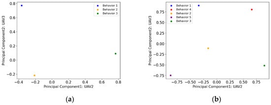 There may be complex correlations between the behavioral variables of multi-agent systems, and analyzing a single behavior variable in isolation often fails to fully uncover the information contained in the data. Furthermore, excessively simplifying the analysis dimensions may result in the loss of key features, affecting the comprehensive understanding of the agents’ collaborative mechanisms and even leading to misleading conclusions. To address this, this study employs principal component analysis (PCA) to reduce the dimensionality of the multi-dimensional data, extract the primary trends of variation, and reveal the behavioral differences of multi-agents in task scenarios, thereby visually demonstrating the individualized behavior patterns between agents [46]. Figure 8 shows the distribution characteristics of different types of agents and their differentiated behavior patterns, reflecting their collaborative and independent traits during task execution.