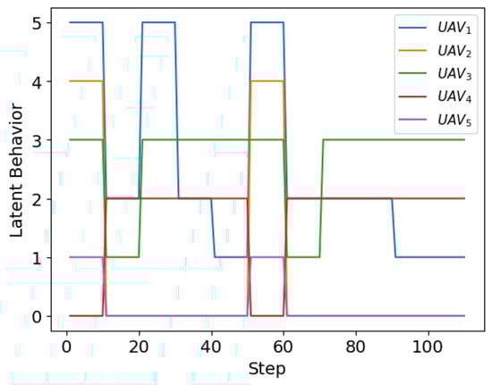 Figure 9 demonstrates the potential behavior changes of the five agents at different time steps. In the swarm formation mission, depending on the mission requirements, each agent will select specific potential behaviors at different time steps, demonstrating the diversity of behavior selection patterns. For example, the agent showed frequent behavior adjustments in the first 60 time steps, displaying a high degree of flexibility, while was more stable in its behavior choices, showing a focus on specific behavior patterns. In addition, there are significant differences in behavior patterns between different agents. For example, showed significantly different behavior choices than and in a given time interval. Such diversity of behavior choices not only reflects the differences in the roles of the agents in the swarm formation mission, but also provides a guarantee for UAV swarms to achieve efficient collaboration and flexible control under complex conditions.