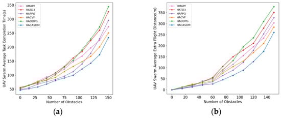 Figure 10a shows the variation in task completion time for the UAV swarm under different algorithms as the number of obstacles increases. The experimental results indicate that as the number of obstacles grows, the obstacle avoidance process for the heterogeneous UAV swarm becomes more complex, and the task execution time accordingly increases. Among the algorithms, the average task completion time of the HACASDM is reduced by 23.92%, 15.69%, 11.52%, 28.63%, and 27.04% compared to HMAPF, HACVF, HAPPO, HATD3, and HADDPG, respectively. Even when the number of obstacles reaches 150, the HACASDM still outperforms the other algorithms, demonstrating higher efficiency and reliability. Figure 10b illustrates the change in the additional flight distance of the UAV swarm as the number of obstacles increases. When navigating around obstacles, the heterogeneous UAV swarm experiences a decrease in obstacle avoidance efficiency and an increase in additional flight distance due to performance differences among the drones. For example, slower drones or those with weaker maneuverability require more time to adjust their paths, leading to an overall increase in the swarm’s additional flight distance. The experimental results show that the HACASDM consistently maintains a lower additional flight distance across all test scenarios, demonstrating superior obstacle avoidance capabilities. Meanwhile, some algorithms experience rapid increases in additional flight distance when the number of obstacles exceeds 100, which may be related to inefficient task allocation strategies.