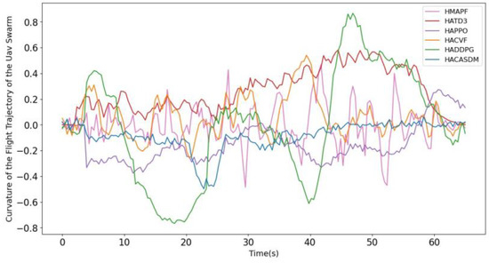 The trajectory data generated by the swarm need to conform to the kinematics and dynamics of each UAV node to ensure the rationality of path planning. The trajectory data include time, position, and attitude, and are expressed as a dense sequence or continuous function, which can be used for path tracking and control. Path curvature is an important geometric property that describes the degree of curvature of a path trajectory and quantifies the degree of trajectory curvature. The larger curvature indicates a more curved trajectory, while the smaller curvature suggests a straighter path [49,50]. In flight, different types of UAVs exhibit different curvature characteristics due to differences in their kinematic properties, and such differences can further affect the overall trajectory stability of the swarm.