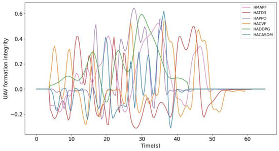 Figure 12 demonstrates the effect of different algorithms on UAV swarm formation integrity control in a complex simulation environment. Due to the differences in UAV platforms, the relative positions of various types of UAVs in a UAV swarm are affected to different degrees by changes in the mission environment. Observing value trends reveals differences in the algorithms’ ability to maintain formation integrity. HACASDM is able to make full use of the different characteristics of UAVs in complex environments to achieve consistent constraints and flexible control of UAV group behaviors, so that the formation similarity can still be maintained at a high level during the flight. The computing data from the experiment simulations show that the formation similarity of HACASDM is improved by 14.65%, 17.08%, 20.59%, 24.89% and 36.15% compared to HMAPF, HACVF, HAPPO, HATD3 and HADDPG, respectively.