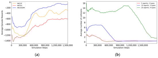 Figure 13a shows the relationship between the number of simulation steps and the average reward value for the three methods. As the number of training steps increases, the average reward values for all three methods show an upward trend. Among them, the HACASDM converges around 900,000 steps, with the average reward stabilizing around 0. Compared to the HACVF and HATD3 methods, the proposed method improves training speed by 17.24% and 28.38%, respectively. This improvement is attributed to the dual-layer imitation learning, which provides strategic insights to the agents, effectively narrowing the policy search space and enhancing the stability of policy optimization. Consequently, it accelerates model convergence, improves training efficiency, and reduces reward fluctuations during training. Figure 13b illustrates the average collision frequency of the HACASDM across different swarm sizes during model training. In the early stages of training, as the number of agents increases, the collision frequency initially rises from approximately 3 collisions per episode with 5 agents to 13 collisions per episode with 20 agents. However, as training progresses, the method effectively reduces the collision frequency, ultimately leading to convergence across different swarm sizes. Specifically, in a heterogeneous swarm system composed of three different types of UAVs, the collision frequency stabilizes at approximately 2 collisions per episode. This result demonstrates that the proposed method maintains stable obstacle avoidance capabilities in collaborative environments involving multi-type UAVs of different sizes.