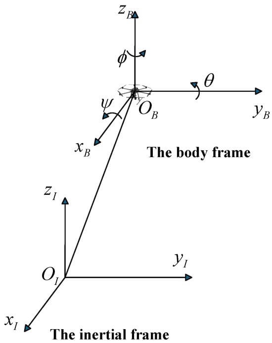 Consider two reference frames: (1) an inertial frame , whose origin is fixed at a specific point on Earth, and (2) a body frame , whose origin coincides with the fuselage center of gravity of the ith UAV. The relations between these two frames are shown in Figure 1. The position dynamics of the ith UAV in the inertial frame can be modeled as [,]