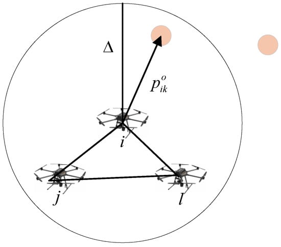 where denotes the displacement between UAV i and obstacle k, denotes the set of the obstacles, and M denotes the number of obstacles.
