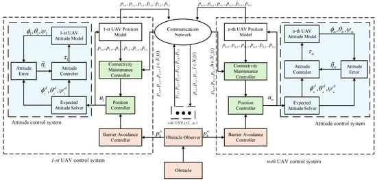 Following the introduction of the potential functions, the distributed position controller is constructed as detailed below. This design integrates the essential components of the potential functions to manage the UAVs’ spatial dynamics effectively, focusing on achieving the desired formations while avoiding obstacles and preserving connectivity.