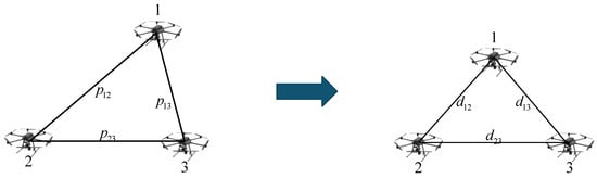 In recent years, academic interest in multiple unmanned aerial vehicles (UAVs) has surged, driven by their potential applications in areas such as remote sensing, search and rescue, traffic monitoring, multi-lifting, and video surveillance [,,,,,,]. Unlike a single UAV, multiple UAVs can operate in parallel, making them more efficient in tasks like large-area surveillance or search and rescue in a collapsed building [,,,,]. Research on the formation control of multiple UAVs has intensified, with a significant shift from centralized to distributed control approaches [,]. However, developing distributed formation controllers remains a challenge, as each UAV has access only to local information.