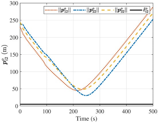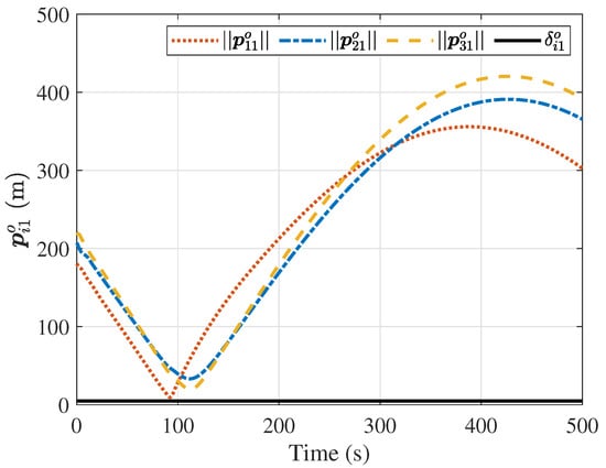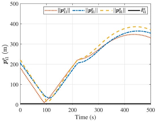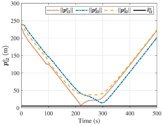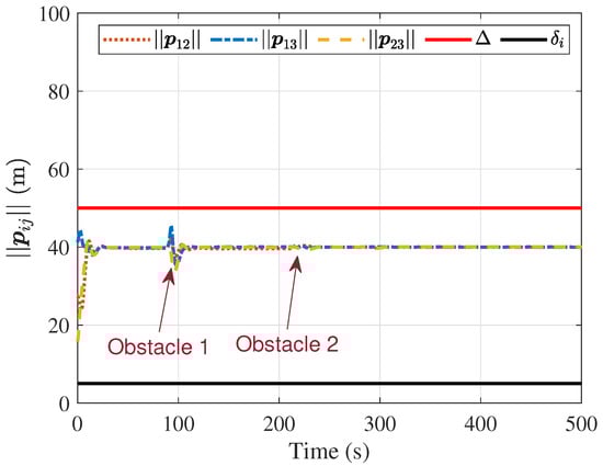 In the prevailing research on distributed formation control of UAVs, it is commonly accepted that the network remains consistently connected [,,,,]. Contrarily, Assumption 1 modifies this to require only initial connectivity rather than continuous connectivity. Assumption 2, also referenced in [], confirms that the specified formation is achievable. Furthermore, Assumption 3 guarantees that obstacles do not prevent UAVs from attaining the desired formation, substantiating the validity of these assumptions.