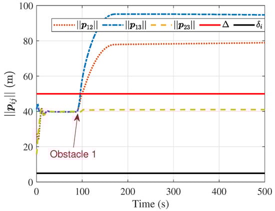 - The distance between any UAV and any obstacle remains greater than at all times, i.e., for all ;