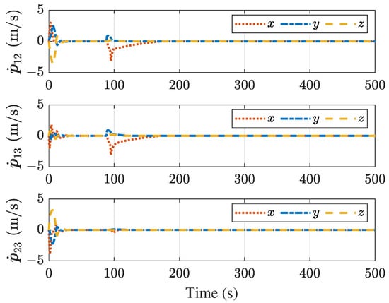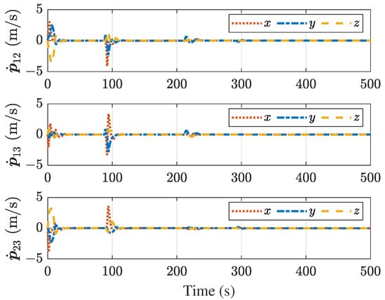 where represents the mass of the UAV, and is a predefined positive constant that limits the maximum allowable change in velocity, ensuring that the system’s response remains within safe operational limits. According to the decomposition principle of E.S. Pyatnitsky, Equation (15) guarantees the controllability of the Lagrangian dynamical system. This setup effectively filters out high-frequency components from the velocity signals, thus smoothing the UAV’s motion and improving its stability and the control accuracy.