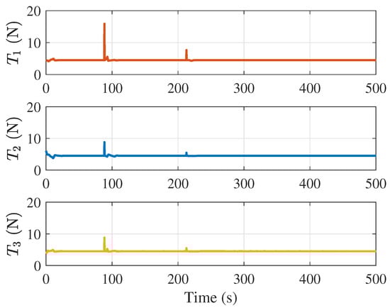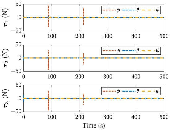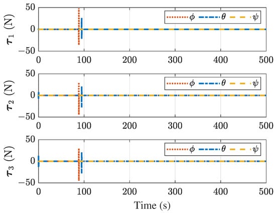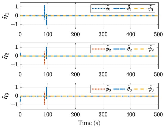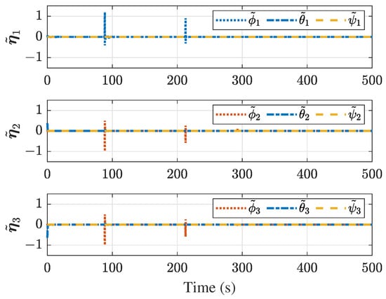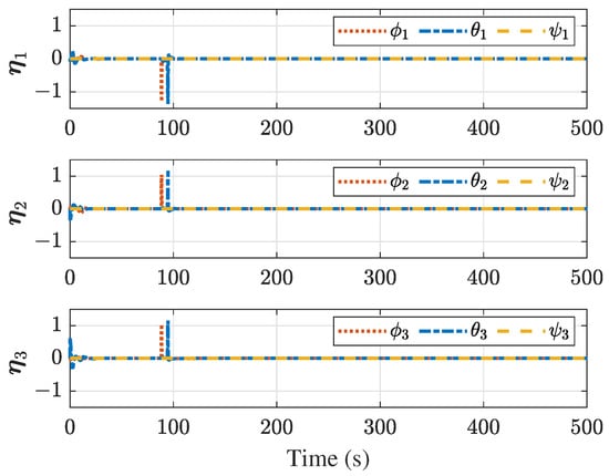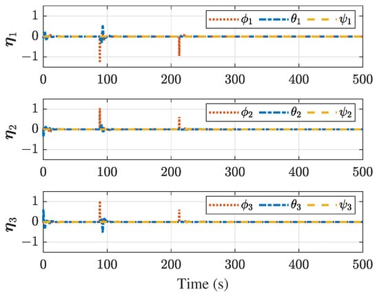 For the attitude dynamics, the Euler angles of the ith UAV are denoted by , where , , and represent the roll, pitch, and yaw, respectively. The angular velocity is expressed in the body frame . The attitude dynamics can be described as follows []: