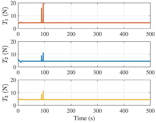 Figure 10, Figure 11, Figure 12 and Figure 13 show that the distances between the UAVs and the obstacles remain greater than the anti-collision distance, ensuring that collisions between the UAVs and the dynamic obstacles are successfully avoided. Figure 11 demonstrates that even without an attraction potential function, the obstacle avoidance potential function can prevent collisions with Obstacle 1. Similarly, Figure 13 shows that the distance between the UAVs and Obstacle 2 does not activate the obstacle avoidance potential function. As a result, Obstacle 2 does not affect the UAV formation control. Figure 14 and Figure 15 illustrate that the attitude of all of the UAVs converges to zero over time. Additionally, Figure 16 and Figure 17 confirm that the attitude tracking errors, representing the difference between the desired and actual attitudes, also converged to zero. Figure 18 and Figure 19depict the total thrust and rotational forces of all UAVs, respectively, while Figure 20 and Figure 21 further detail the rotational forces. These results indicate that the proposed controllers can successfully achieve the desired formation while preserving connectivity, avoiding collisions, and steering clear of obstacles. In contrast, the controller without connectivity preservation only avoids obstacles and collisions.