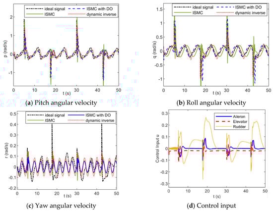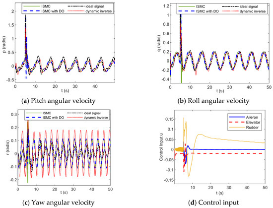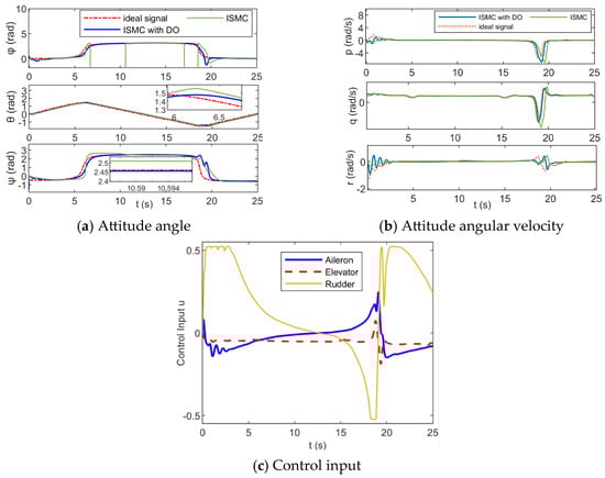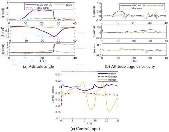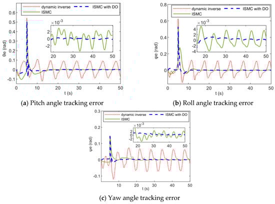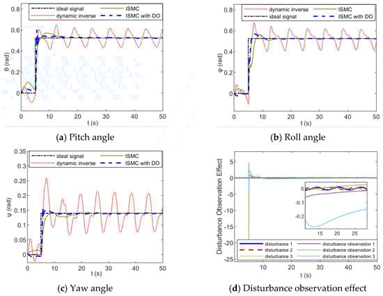 Figure 3, Figure 4 and Figure 5 reveal a noticeable overshoot in the attitude angles when employing dynamic inverse control, especially when exposed to external disturbances. In such conditions, tracking errors oscillate within , rendering this approach insufficient for accurate attitude tracking. In contrast, the attitude control strategy based on ISMC-DO excels in rapid tracking performance, even in the face of parameter uncertainties and external disturbances. Each attitude angle manifests minimal overshoot, and the adjustment time falls within a 3 s window. Moreover, the angular velocity closely adheres to the guidelines set by the inner loop instruction. Therefore, the ISMC-DO technique demonstrates superior efficacy in both tracking speed and control accuracy.