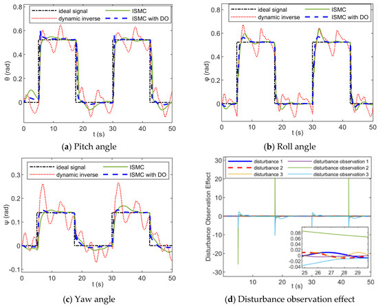 While step response serves as an insightful tool for gauging the performance of the controller, real flight conditions often require tracking of a command signal. Therefore, we subjected the dynamic inverse control, ISMC, and ISMC-DO methods to square-wave tracking. In these tests, external disturbances were designated as , and the angle tracking instructions were characterized as square waves. Specifically, and are square waves featuring an amplitude of π/6 rad, a period of 25 s, a 50% pulse width, and a 5 s phase delay; follows similar characteristics, but with an amplitude of 2π/45 rad. Figure 6, Figure 7 and Figure 8 illustrate the resulting effects on attitude tracking.