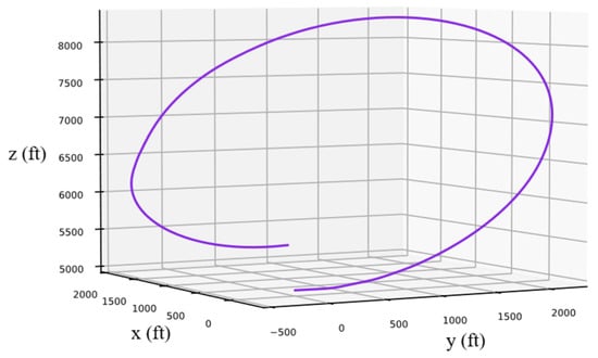 Frequently termed a “rising half-roll inversion”, the Immelmann turn consists of a forward somersault initiated from level flight. Upon reaching the zenith of the somersault, the UAV swiftly transitions from an inverted to an upright orientation, subsequently leveling out. This particular maneuver offers tactical advantages, such as rapid altitude gain and a superior position for trailing enemy aircraft. Figure 15 and Figure 16 display the simulation outcomes for this maneuver.