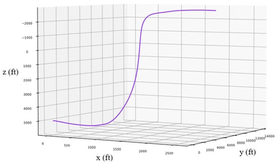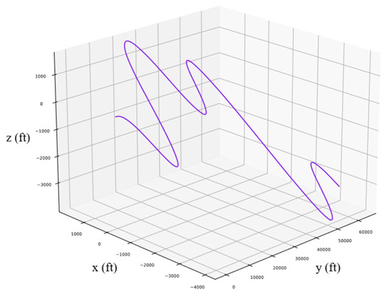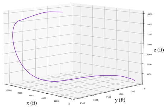 The “split-S” maneuver is essentially a half-inverted somersault that originates from a roll. This maneuver not only amplifies the velocity of the UAV, but also results in a reduced altitude and a 180° change in course. The resulting simulation data for the “split-S” maneuver are displayed in Figure 11 and Figure 12.