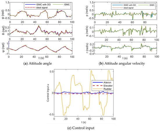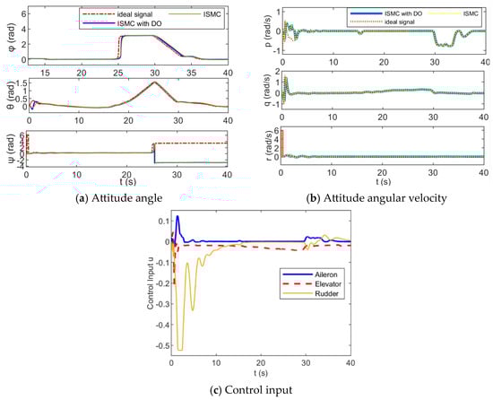As delineated in these figures, the “Pougatcheff cobra maneuver” instigates periodic course adjustments for the UAV through alternating roll angles ranging approximately between 30° and −30. This alternation manifests as a serpentine-like horizontal flight path. Concurrently, the yaw and pitch angles undergo nearly periodic fluctuations. Amidst these complex conditions, the ISMC-DO control system proves its capability to adhere to maneuvering instructions under stringent testing scenarios.