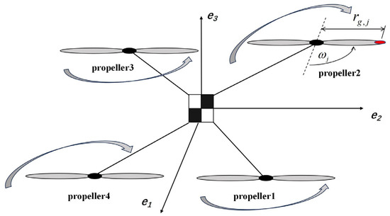 During the flight process, the propeller of the multi-rotor may be damaged due to external disturbance. Assuming that the multi-rotor propeller is damaged in one or more places, the four-rotor is analyzed, as shown in Figure 1; the fault parts of the propeller are marked in red, and the fuselage frame is defined with the ternary groups e1, e2, and e3.
