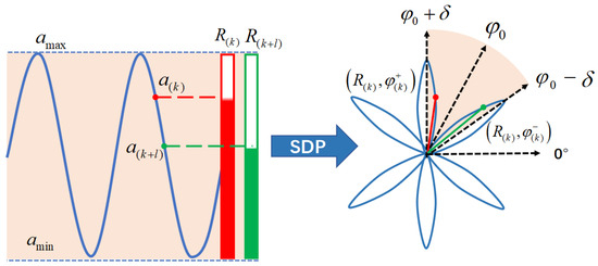 The principle of the SDP [18] is to transform the time-domain signal acquired by the sensor into a two-dimensional image in polar coordinates through the corresponding formula, and the fault information of the signal is expressed through the difference in the image. The SDP algorithm establishes the mapping relationship between Cartesian coordinates and polar coordinates based on the kth value and the (k + l)th value in the discrete-time series. It presents the signal as a symmetrical snowflake graph [19], and the basic schematic is shown in Figure 2.