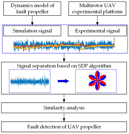 In this study, a propeller fault detection method based on the built-in IMU acceleration signal of a multi-rotor flight control system is proposed; it does not require the installation of additional sensors, which is conducive to reducing the detection cost, and it can be applied to realize real-time fault detection. Based on the dynamics analysis of propeller faults, this study provides a theoretical basis for separating fault information-rich components from multiple coupled signals. The quantization of the SDP results using the similarity index further expands the application scope of the SDP algorithm. The simulation and experimental results show that the proposed method can effectively identify propeller faults in multi-rotor drones.
