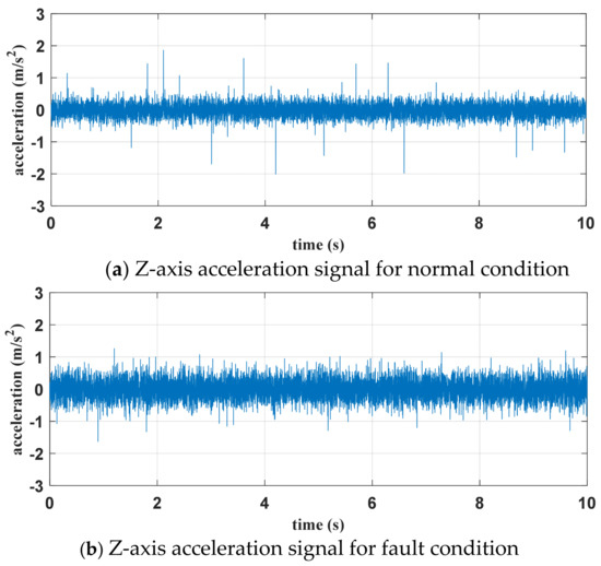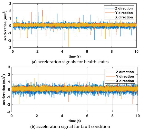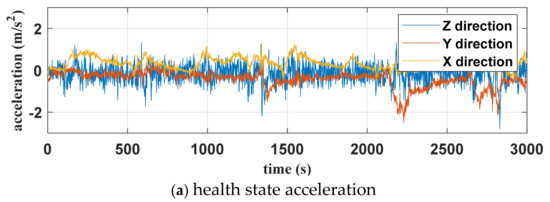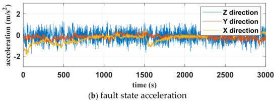 Based on the weight of the drone, the angular velocity of the quadcopter drone propeller in the hovering state can be calculated as 3872.98 rad·s−1. Then, the acceleration signals in the x, y, and z directions in the hovering state of the multi-rotor drone are obtained by substituting the parameters in Table 1 into Equation (13), as shown in Figure 4a. When the propeller fails, α1 is 0.03, α2 is 0.012, and the obtained acceleration in each direction is as shown in Figure 4b.