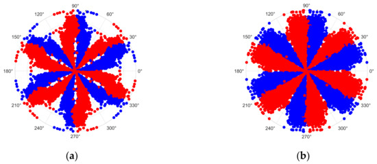 Figure 5a shows that the snowflake map has a smaller fan blade thickness and a larger curvature, showing a uniform dispersion. Compared with Figure 5a, the outer thickness of Figure 5b is obviously larger than the center thickness, and the data are more discrete. Therefore, the proposed method can effectively detect propeller faults.