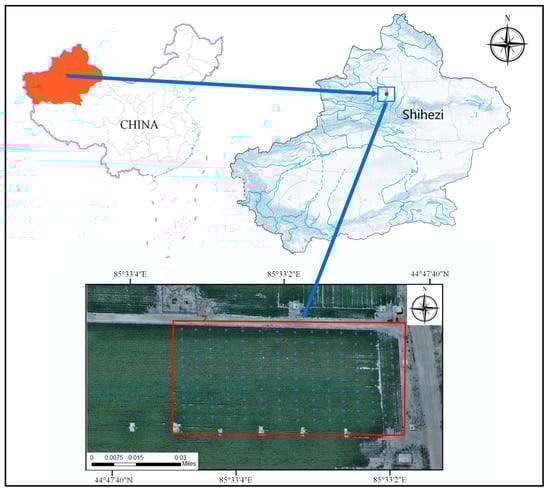 This experiment was set up in a 6.07 ha study site located in the 121st Corps, Shihezi City, Xinjiang Uygur Autonomous Region, China (longitude 85°33′22″ E, latitude 44°47′21″ N; elevation: 450 m; see Figure 1 for the geographic location), which is located in a temperate continental arid climate zone, with average annual temperature, rainfall and sunshine hours, respectively, of 6.5–7.2 degrees Celsius, 170 mm, and 2780 h. The soil type is mainly sandy, with a pH value of 7.2~8.5 [12]. In this experiment, the early-maturing cotton seed Xinluzao 57 was selected, and mechanized precision sowing was carried out on April 20, with the planting density set at 18,000 plants/hm2. The experimental cotton field did not apply potassium, phosphorus, and plant growth regulators, and the management of the cotton growth process is the same as that of the local non-experimental site. In this experiment, there were 150 sampling points.
