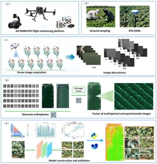 Cotton field image acquisition system and remote sensing data analysis process. (a) Drone flight monitoring platform, (b) Collection of ground-truthing samples, (c) Image data collected by the UAV flight platform, (d) Fusion of multispectral images with panchromatic images, (e) Construction of Machine Learning Models.