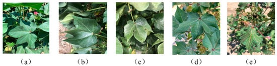 Cotton leaves with different levels of infestation: (a) level 0 leaves, (b) level 1 leaves, (c) level 2 leaves, (d) level 3 leaves, and (e) level 4 leaves.