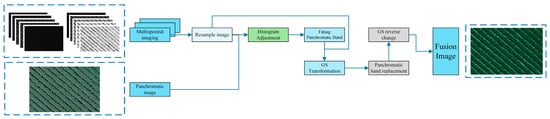 Gram–Schmidt (GS) fusion [23] is an image enhancement technique based on orthogonalized vector space projection, which maximizes the preservation of the original spectral features while enhancing the spatial detail to the panchromatic band level. The method is based on the GS orthogonal decomposition framework, which generates a synthetic panchromatic image by linearly combining multispectral bands as initial orthogonal basis vectors and iteratively calculates the orthogonal components on a band-by-band basis. Subsequently, the high-resolution panchromatic picture replaces the first orthogonal basis vector, and the fused image is reconstructed by inverse transformation with the formulas as shown in (2)–(5) [24]. Due to the local spectral fidelity consistency characteristics of synthetic panchromatic images with real panchromatic bands, the fusion effect of this type of method is better than other image fusion methods based on matrix analysis, which are suitable for agricultural pest monitoring. This method realizes data redundancy reduction by compressing the spectral dimensions of multispectral images by principal component analysis (PCA) and extracting the orthogonal principal components with maximum variance contribution [25], and ensures the independence between principal components through the Gram–Schmidt orthogonalization process. Then, the detailed information of the high-resolution panchromatic data are precisely embedded into the first principal component of the multispectral data, and the fusion coefficient is used to control the degree of fusion. Finally, the inverse PCA transform is applied to restore the fused principal components to the initial picture space to obtain the final high-resolution fused image (Figure 4).
