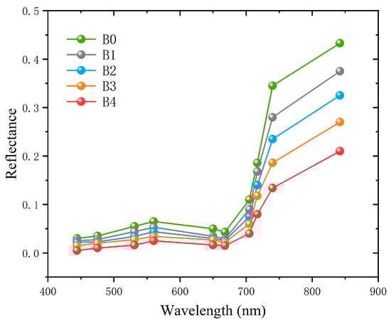 The reduced chlorophyll content after aphid infestation results in lower reflectance in the blue (450–495 nm) and red (620–700 nm) bands. This manifests as a significant decrease in reflectance within these bands. Significant variations between groups with pest indexes of B0, B1, B2, B3, and B4 were seen in the spectral features of the cotton plant cover under cotton aphid stress, as illustrated in Figure 5.