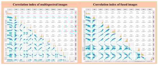 The selected spectral indices and aphid indexes were analyzed for correlation and the relationship between them was demonstrated by plotting a correlation heat map, as illustrated in Figure 6. The investigations revealed that ARVI (0.77), SAVI (0.68), GBI (0.66), and ARI (0.60) were the top four spectral indices with the highest absolute values of correlation coefficients in the multispectral images. In contrast, GLI (0.89), RVI (0.83), DVI (0.79), and SAVI (0.78) were the top four indices in the fused panchromatic and multispectral pictures, with the correlation coefficients with the maximum absolute values. Aphid infection levels and spectral indices were significantly correlated, according to the results in Table 4. Further analysis revealed that the correlation’s absolute value coefficients between the fused panchromatic and multispectral images were significantly higher compared to the original multispectral data, and the correlation between the fused images and the extent of aphid infestation was more significant (Table 4). These findings provide an important reference for the variables chosen for the regression model. Based on the magnitude of the correlation coefficient |r|, the index with stronger correlation can be chosen as the regression model’s input variable, and the precision of the model’s estimation can be confirmed by contrasting the model’s predicted and measured values (R2, RMSE).