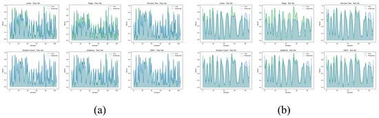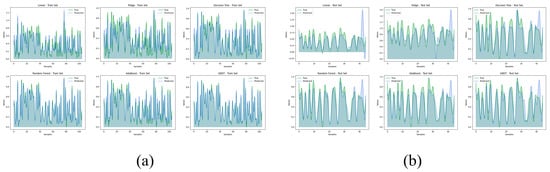 Plot of true versus predicted values of machine learning models fitted to multispectral image data: (a) training set; (b) test set.