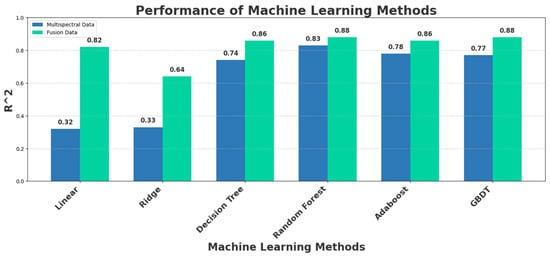 In order to specifically assess the difference in model monitoring performance between the two image datapoints, Figure 9 shows the R2 ranges of the multispectral image data and fused image data on the validation set. The R2 range of multispectral image data was 0.32–0.83, while that of the fused image data was 0.64–0.88. As can be seen in Table 5, the fused R2 all improved to different degrees. It is evident from comparing the R2 values of the two datasets that the model built using the fused image data performs noticeably better in terms of monitoring accuracy and shows a stronger capacity for prediction than the model built using the multispectral image data. This result shows that the fused image data can capture the aphid damage information more effectively, which provides important technical support for the construction of high-precision aphid damage monitoring and prediction models.