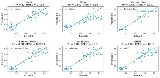 The performance of the regression model was jointly assessed using the coefficient of determination (R2) and the root mean square error (RMSE), where R2 quantifies the model’s ability to explain the variance of the target variable (0 ≤ R2 ≤ 1, the fit is better when it is closer to 1 and poorer when it is closer to 0.). The RMSE, on the other hand, reflects the absolute deviation of the predicted value from the true value, which indicates the average size of the model’s prediction error. A smaller RMSE indicates that the model has a smaller prediction error, which means that the model has a better prediction performance. R2 and RMSE are calculated by Formulas (6) and (7).