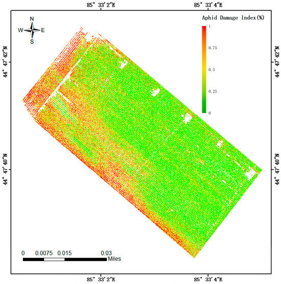 Based on the validation results in Section 3.2, four vegetation indices (GLI, RVI, DVI and SAVI) from the fused image data were selected as key variables and input into six models, namely, Linear, Ridge, Decision Tree, Random Forest, AdaBoost and GBDT, respectively, for constructing the monitoring model of cotton aphid damage. According to the findings, the best model for tracking aphid damage in cotton was the GBDT regression model. With a coefficient of determination of R2 = 0.88 and an RMSE of 0.0918, the GBDT regression model outperformed the other models substantially, according to the results. Therefore, the GBDT model was finally selected for the inverse prediction of harm from cotton aphids in the experimental cotton field. The cotton aphid disease index prediction results are displayed in Figure 11, where the colors progressively deepen from yellow to red. This visually represents the spatial distribution of aphid damage in the area and intuitively reflects the trend of cotton aphid damage in various spatial locations.