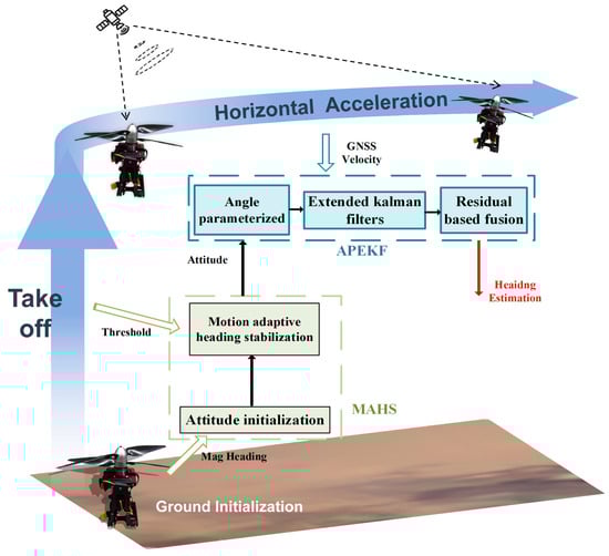 A heading estimation method based on Angle-Parameterized Extended Kalman Filter (APEKF) is proposed to address the challenges associated with heading estimation for micro coaxial drones. As shown in Figure 1, the heading is modeled firstly, and the motion characteristics are analyzed to accurately describe the attitude changes. Accordingly, the Motion-Adaptive Heading Stabilization (MAHS) algorithm is introduced to effectively enhance the initial stability of the heading estimation during take-off. The combination of angle parameterization and multi-sub-filter fusion in the APEKF facilitates the integration of GNSS observation information to achieve rapid alignment, resulting in high-precision heading estimation. The excellent accuracy of this method and stability in complex maneuvering environments are confirmed by both simulations and real-world experiments.