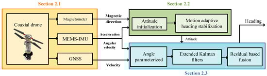 This section provides a detailed account of the methodology for estimating heading in micro coaxial drones. Section 2.1 defines the coordinate system and heading model of the coaxial drone, and its kinematic characteristics are subjected to a comprehensive analysis. Subsequently, Section 2.2 presents the heading initialization and stabilization estimation method based on MAHS technology, focusing on its utilization for initial alignment on the ground and heading estimation during a stable take-off. Finally, Section 2.3 provides a comprehensive explanation of the application of APEKF. Integrating GNSS velocity information ensures the coaxial drone can rapidly and accurately align its heading after take-off. Figure 2 illustrates the overall structural block diagram of this method.