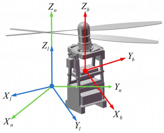 As shown in Figure 3, three coordinate systems are introduced to describe the heading of a coaxial drone in space. The frame represents the airframe coordinate system, in which the origin of the frame is at the center of the mass of the drone; points to the front; points to the right; points to the top; the frame represents the navigational coordinate system, in which points to the north; points to the east; points to the sky; the system represents a local coordinate system rotated from the system by the heading angle . The attitude is represented by the Euler angle.