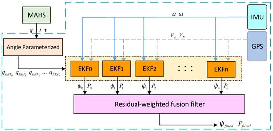 The heading parameterization quantity introduces split confidence intervals, assuming heading intervals of 15° []. The initial quaternions of the sub-filters are calculated as the outer product of the initial quaternions with one assumed quaternion to derive the initial state assigned to each sub-filter, ensuring that they can be computed independently for different assumed heading angles.