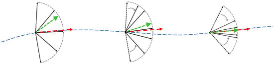 The heading used in this study is defined as positive northeast, driven by the velocity increments to the north and east in the horizontal plane and the angular increment around the vertical axis. Assuming that the heading has measuring errors associated with these three incremental noises, it is necessary to initialize the heading, specified by parameterizing the angle, before executing the fast alignment algorithm. Multiple hypothetical heading angles preset on the horizontal plane are updated independently and iteratively by the horizontal plane velocities provided by the GPS observations. As demonstrated in Figure 5, the red arrow denotes the true heading, the green arrow indicates the heading obtained from the final fusion result of the residual filter, and the black arrows represent the heading estimates provided by the sub-filters. The blue dashed line is a representation of the top-down view of the carrier’s movement direction, from left to right. After several iterations, these individual estimates gradually converge to the accurate value due to the influence of the residuals with the true heading.