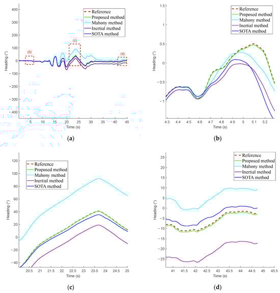 Figure 7a illustrates that the simulation was initially conducted during the take-off phase, and the outcomes of the four heading estimation techniques are presented. The initial heading was set to 0°, with the first five seconds representing the initialization phase, during which the drone remained stationary on the ground, followed by the take-off. After take-off, the simulation demonstrated that the drone executes substantial maneuvers, with the maximum heading change reaching approximately 90°. Figure 7 highlights three representative key positions, defined by red dashed boxes, with the details. Additionally, Figure 7b–d present localized enlarged views of Figure 7a.