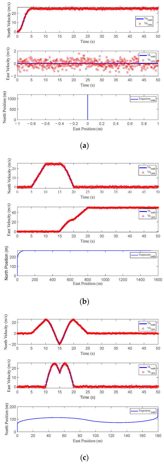 Figure 8 presents the results of three sets of simulations conducted under three different horizontal motion modes. Figure 8a–c represents linear acceleration, turning acceleration, and curved motion, respectively; in the figures, the blue line represents the true value in the simulation, whereas the red dots indicate the GPS velocity observations.