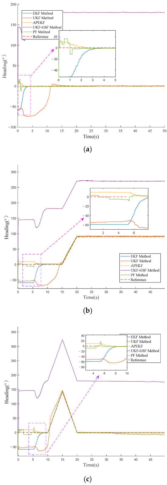Comparison of heading estimation across five filters during horizontal maneuver simulation. (a) corresponds to Simulation 1; (b) corresponds to Simulation 2; (c) corresponds to Simulation 3.