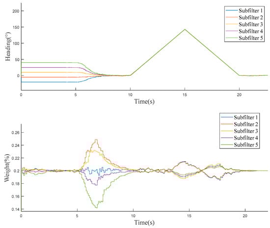 The fusion weight calculation method is based on velocity residuals, using the Euclidean distance of the velocity residuals from each sub-model to determine the corresponding weights . Normalization and smoothing are executed for the residuals, and the contribution of each sub-model is dynamically adjusted in the heading estimation. These weights are used to adjust the state vector and covariance matrix of multiple models to solve the issue. To avoid the angle wrap-back problem, the heading states are converted to vectors with a length equal to the weight value 1 before summation. Following normalization, the state variable and the corresponding covariance matrix are produced based on weight fusion.