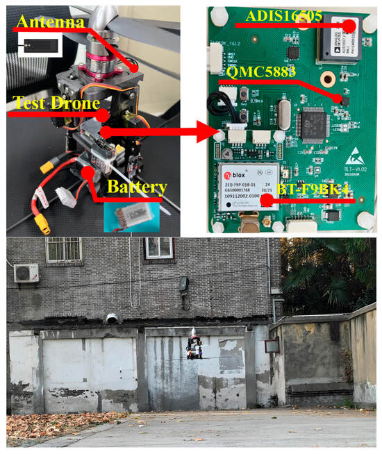 Figure 11 illustrates the configuration of the experimental setup. The drone weighs approximately 416 g and is configured as a coaxial rotor helicopter with a strongly coupled six-degree-of-freedom mechanical structure. Its propulsion system comprises two brushless direct current motors that rotate in opposite directions at an oblique incidence angle, while two servo motors are installed on the lower rotor. The sensors are installed on the drone body and its core board, with data acquisition achieved via the STM32F446 microcontroller serial port, thereby enabling the simultaneous collection of raw data from multiple sensors. The experiment used the QMC5883 magnetometer to provide 100 Hz triaxial magnetic field data, while the IMU provided 400 Hz acceleration and angular velocity data. The IMU and magnetometer are integrated into the main control core PCB, while the GNSS antenna is mounted vertically on the carbon fiber support rod on the side wing of the drone. To enhance the precision of the reference data in the experiment, a dual-antenna orientation device, SINOm100W, was positioned on the support frame beneath the drone, providing heading reference data with an accuracy of 0.1° (this device was solely employed for experimental true value comparison and is not incorporated into the actual design).