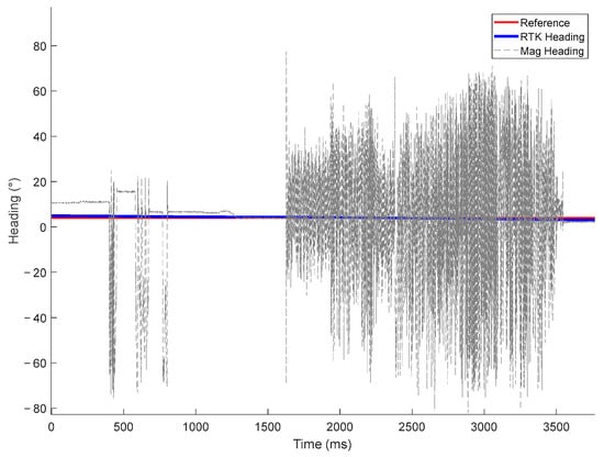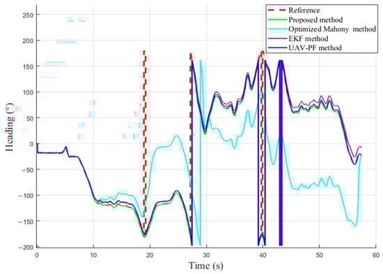 Figure 14 presents the results of the heading estimation conducted using various methods in the onboard experiment. The experiment included the initialization, take-off, and horizontal maneuvering phases, during which several algorithms were compared: the EKF method [], the Optimized Mahony filter method [], the UAV-PF method [], and the proposed method. Moreover, the red reference line in Figure 13 denotes the output of the heading reference device. Given that the system delineates the heading angle within a range of −180° to 180°, the reference value at the 19-s and 40-s mark, though exceeding −180° and approaching 180°, does not signify any substantial change in the actual flight heading of the aircraft. The experiment focused on the initial five seconds of the MAHS phase, during which the MAHS algorithm demonstrated its efficiency in suppressing magnetic interference at the initial startup of the motor. Subsequently, APEKF performed rapid heading alignment using GNSS velocity data. The entire experiment demonstrated the effective combination of these two algorithms, significantly improving the accuracy and convergence speed of the heading estimation.