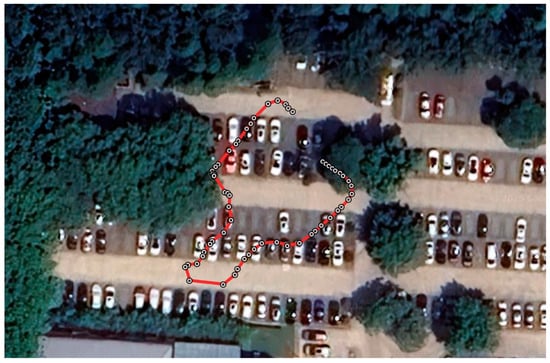 Figure 12 demonstrates that, during the ground initialization phase, the magnetometer’s heading calculation was influenced by a certain degree of magnetic declination. The magnetometer data are represented by a light grey dashed line, with the red line denoting the reference heading. Nevertheless, this interference was relatively minor compared to the significant magnetic interference generated during high-power operations of the motor after take-off, resulting in a discernible escalation in magnetic interference. Figure 12 emphasizes the necessity of effectively addressing motor interference during heading estimation to ensure flight. Figure 13 presents the flight path that was recorded during a field test that was conducted in a parking lot. GNSS was utilized to acquire latitude and longitude data, which were subsequently displayed on Google Earth to illustrate the operational trajectory. The trajectory encompassed a distance of approximately 65 m. Key waypoints were delineated under real-world conditions.